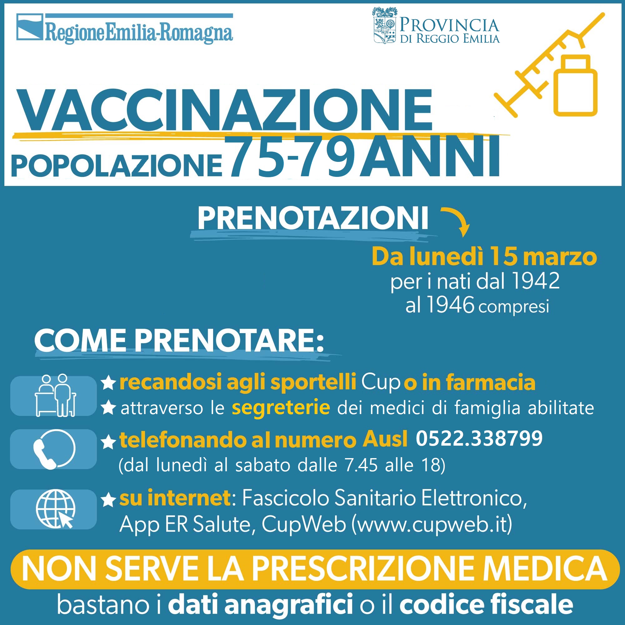 regione emilia romagna vaccino anti covid dal 15 marzo possono prenotare le persone tra i 75 e i 79 anni i nati negli anni 1942 1943 1944 1945 e 1946 al cup